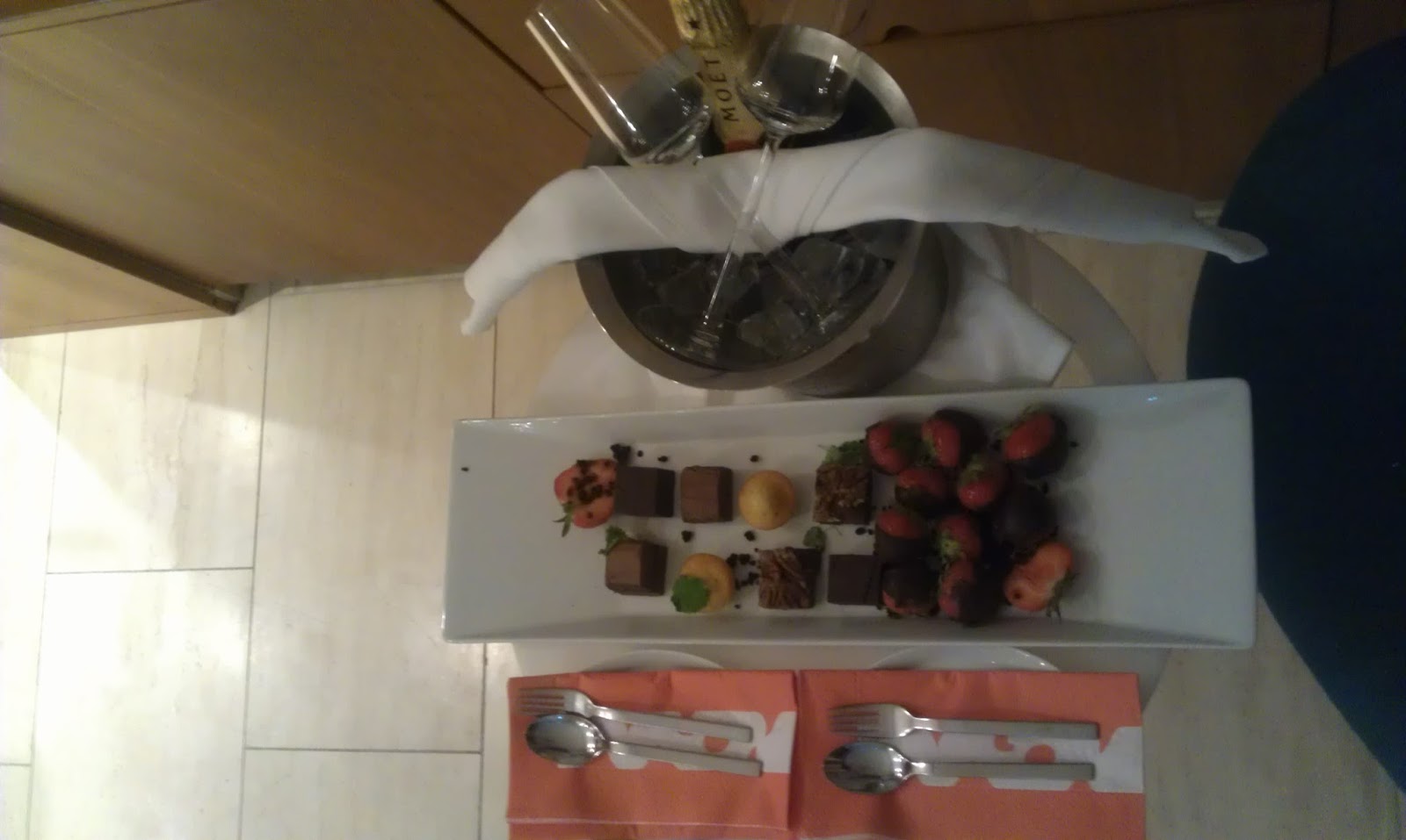 När vi kom tillbaka på kvällen, efter bröllopet, så hade dom gjort i ordning sängen och dukat upp med champagne, chokladdoppade jordgubbar och tryfflar ..